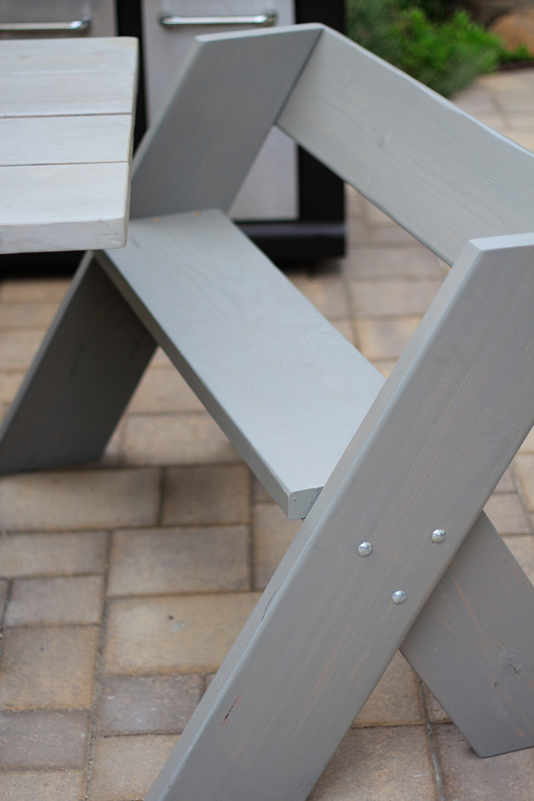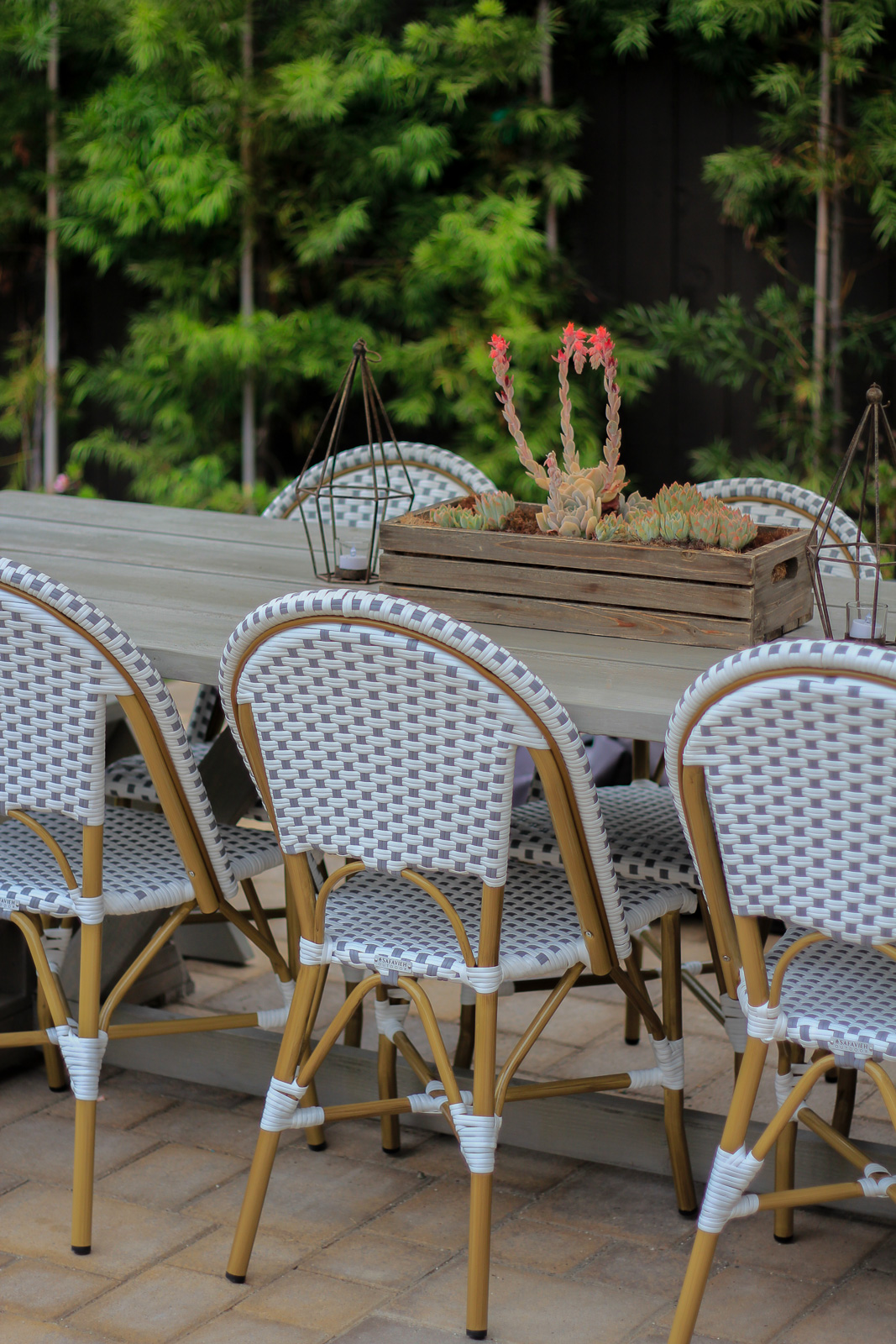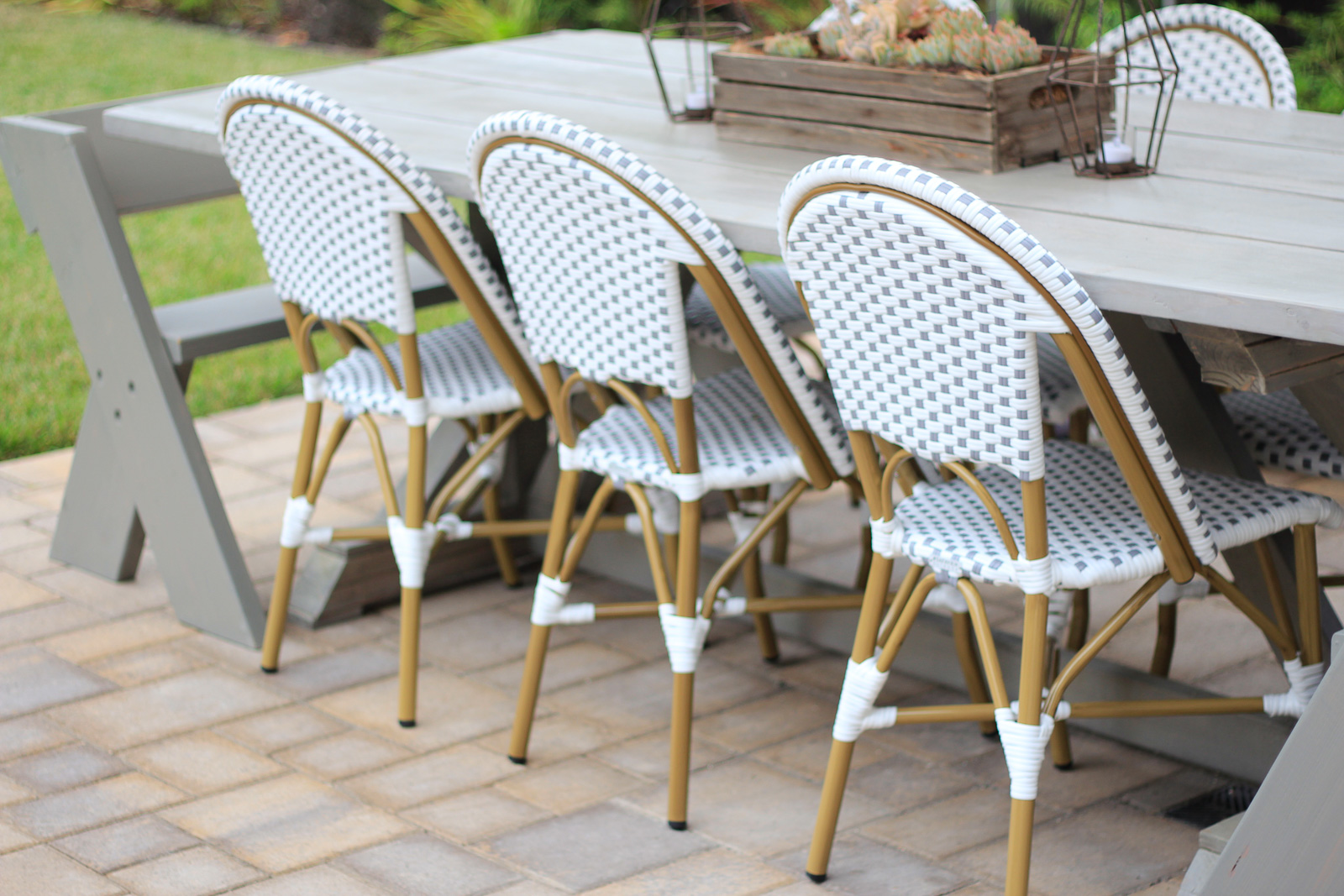 Today I wanted to share our outdoor dining space since I FINALLY got in my dining chairs! Story behind these chairs: I spotted them back in April and knew I had to have them since they’d go perfect with the outdoor dining table (that my husband built, BTW, along with the benches!) But as my luck would have it, the grey color was sold out and according to Wayfair’s site, they wouldn’t be restocked until August. What the what?