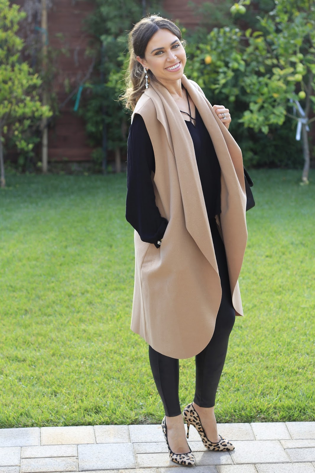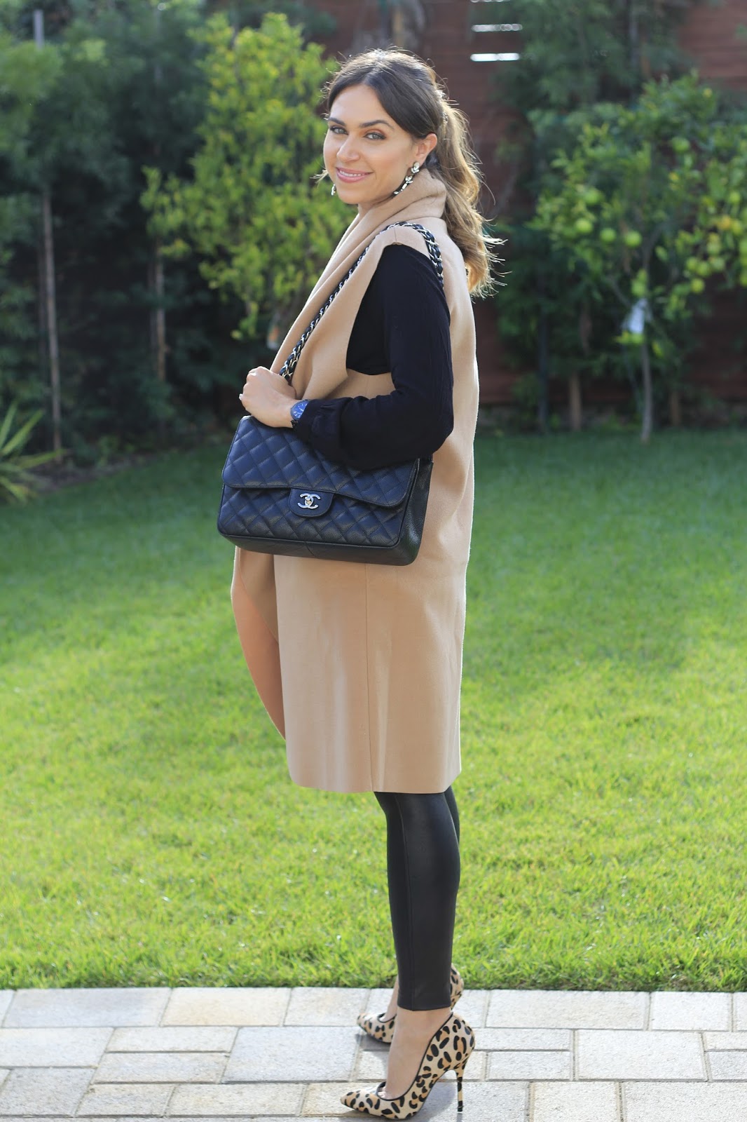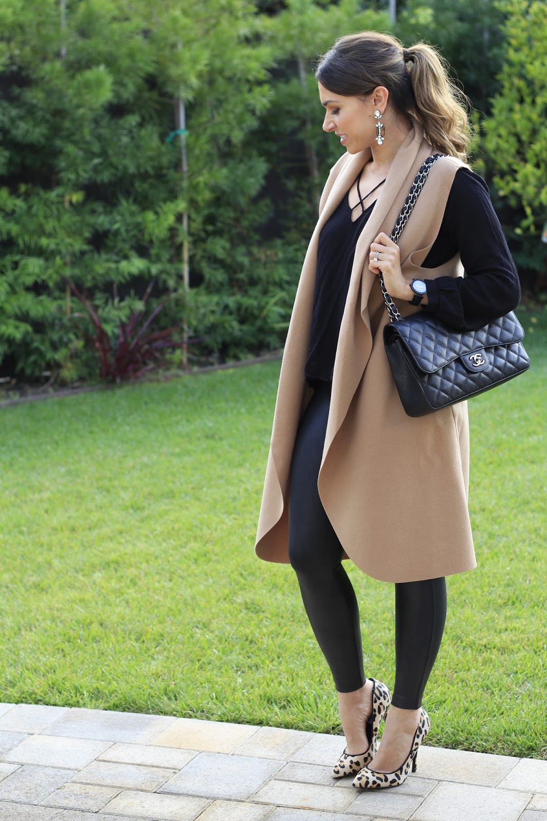 Waterfall Drape Front Vest (similar here) :: Spanx Faux Leather Leggings :: Blouse :: Leopard Pumps (similar) :: Chanel Purse