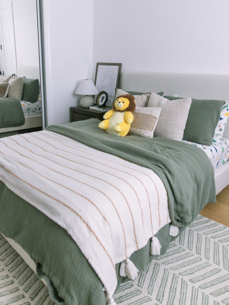 I FINALLY got around to making some updates to my boys’ rooms. For my oldest, I swapped out his bedding to make it more masculine and less “babyish”. For my youngest, I finally decided to get rid of the toy room and covert it into his big boy room. While it’s still far from done (there’s still toys to get rid of and I want to do some type of wall paneling in there), I’m happy with the direction it’s heading. We got him the Nora Dresser, Nora Nightstand and the Dean Upholstered Panel Bed all from Living Spaces. I got both boys’ bedding from Quince, specifically the Organic Airy Gauze Duvet Sets in olive and charcoal. I’ll link more details below (affiliate links). Stay tuned for more updates!